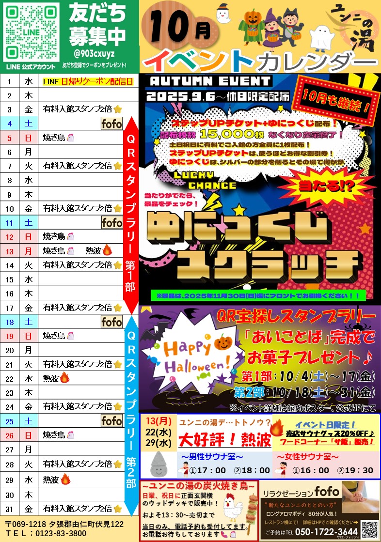 ユンニの湯では様々なイベントを企画してお客様のお越しをスタッフ一同心待ちにしております。