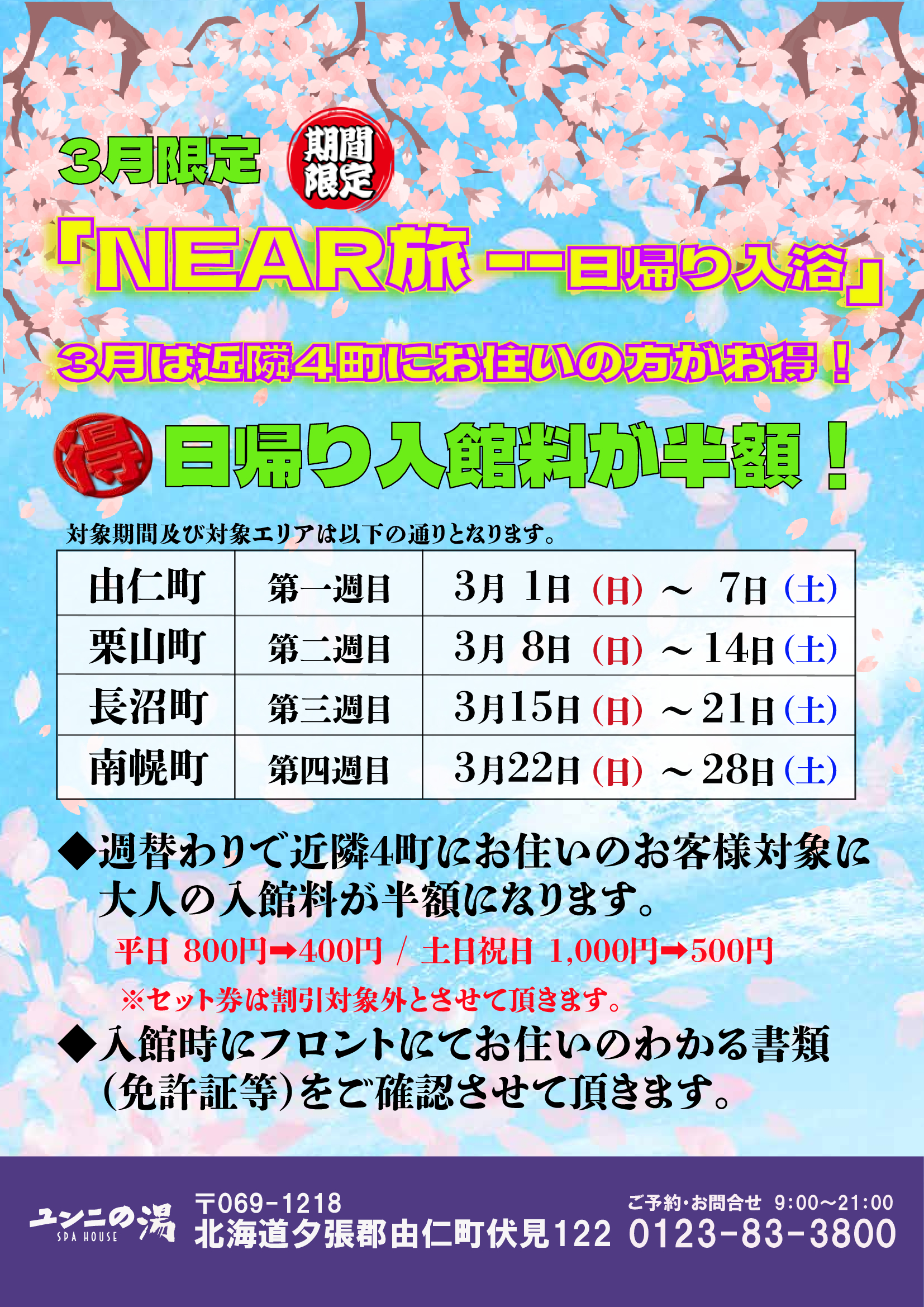 3月限定 「NEAR旅」 日帰り入浴半額! new