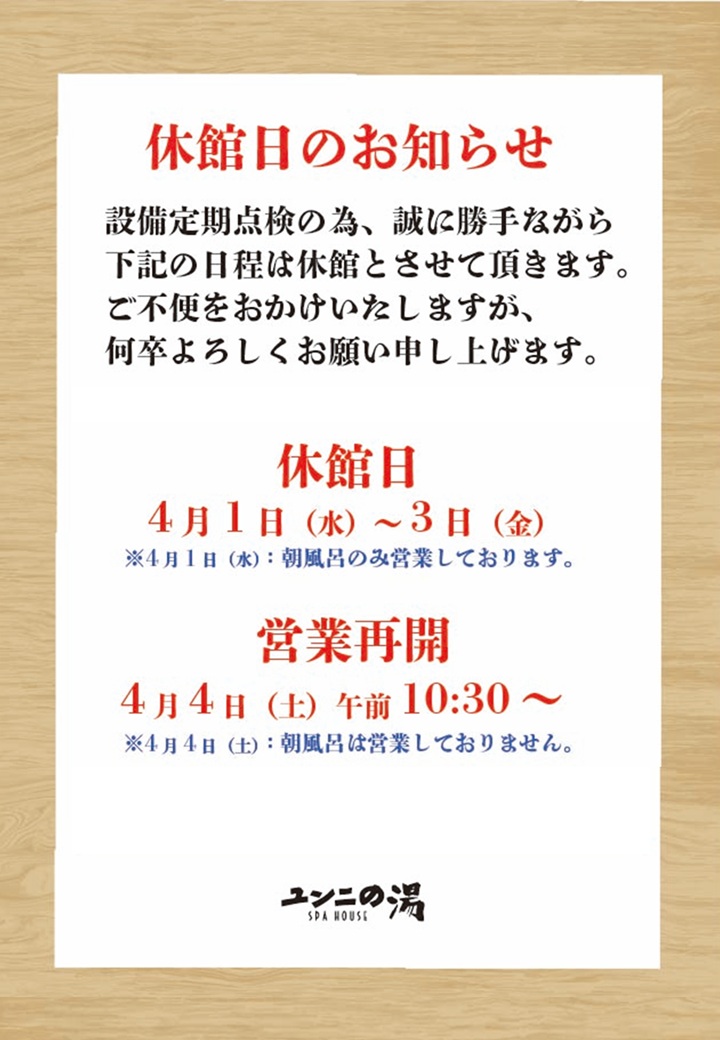 ※4月4日(土)は、朝風呂は営業しておりませんので、ご注意願います。